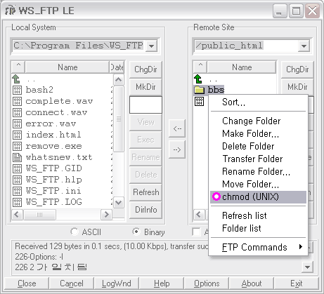 ws-ftp¸¦ ¿¹·Î µé¾îº¸¸é, bbs Æú´õ¿¡¼ ¿À¸¥ÂÊ ¸¶¿ì½º¸¦ Ŭ¸¯ÇßÀ» ¶§ ³ª¿À´Â ÆË¾÷â¿¡¼